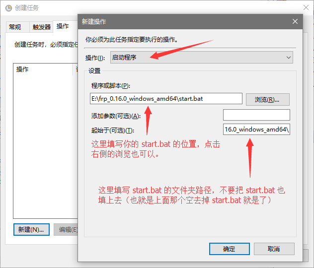 例如你的 start.bat 在 E:frpstart.bat,那么你只需要在 “起始于” 填写 E:frp