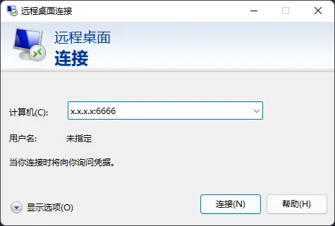 在另外一台电脑上打开 Windows 远程桌面连接,输入服务器 IP 和端口,并输入系统管理员的用户名和密码,就可以实现远程桌面连接。