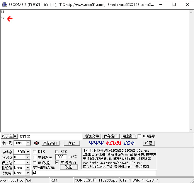 正常的情况下,窗口会出现ESP8266模块的回传 OK“”,如下图↓