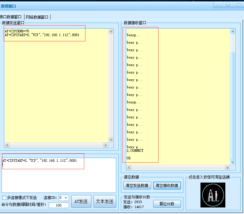 发送指令:AT+CIPSTART=2,"TCP"," 192.168.1.112",8081