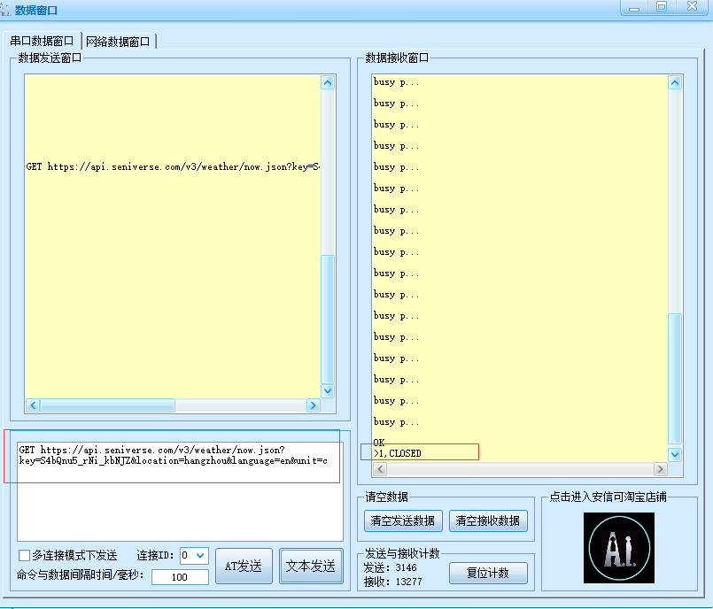 实际情况:提交GET请求后,知心天气网站的服务器关闭了,如下图,并且8266模块死机了。我上网查找了不少资料,了解到很少有人用AT固件下的多路连接这种方式去实现多路连接下的GET功能,原因大多数解释为:esp8266在多路连接模式下不能进入透传模式,而实现类似功能的解决方案都是基于SDK实现的,所以这种实现方案失败了,如有大佬晓得什么原因及解决方案,欢迎留言评论。