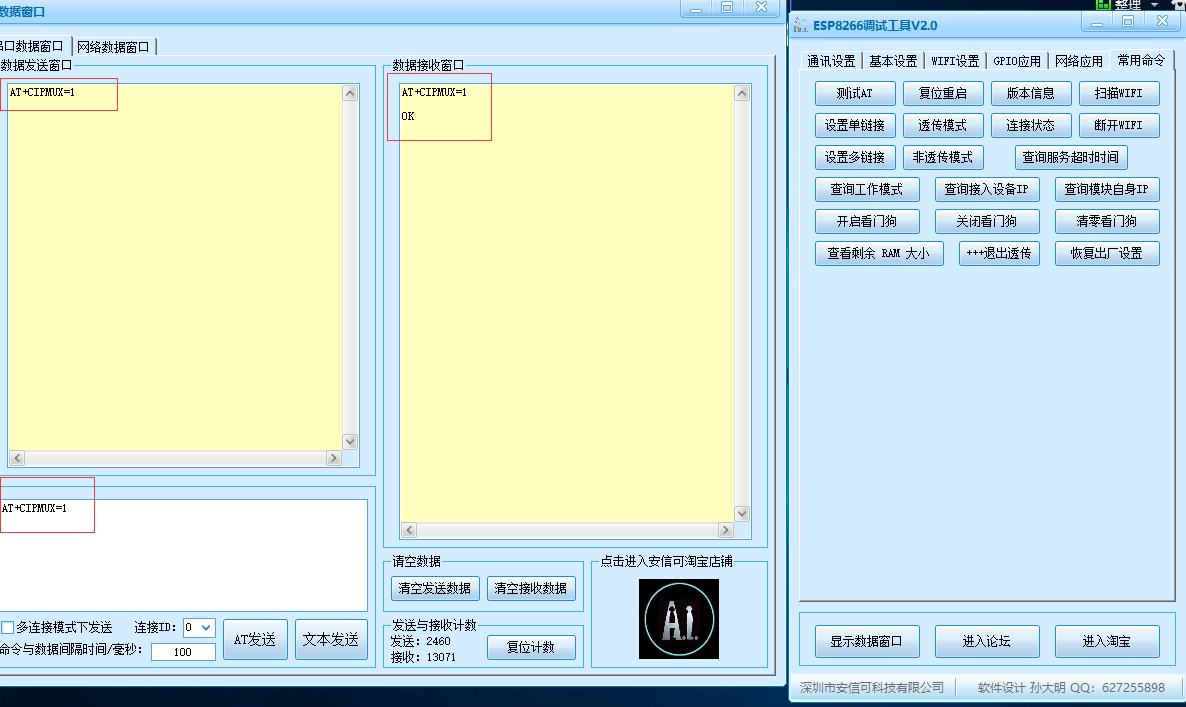 1)设置8266模块:开启多连接模式(因为模块要连接多个服务器,所以选择多连接模式,如果模块只与一个服务器通信时选择单连接模式即可)