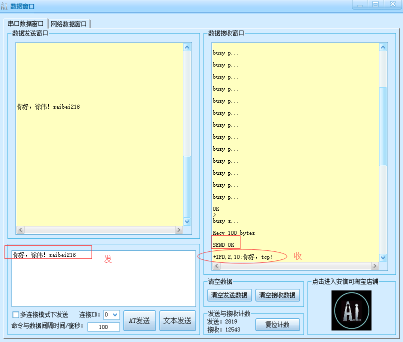 发送指令:AT+CIPSEND=2,100 //选择需要用于传输连接的id号