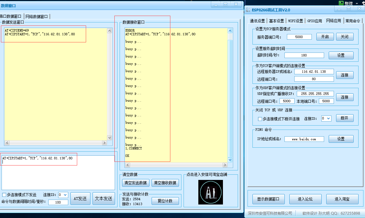 AT+CIPSTART="TCP","116.62.81.138",80 //连接知心天气网站服务器