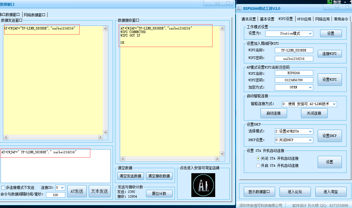 发送指令:AT+CWJAP="TP-LINK_5D3BDE","saibei216216"