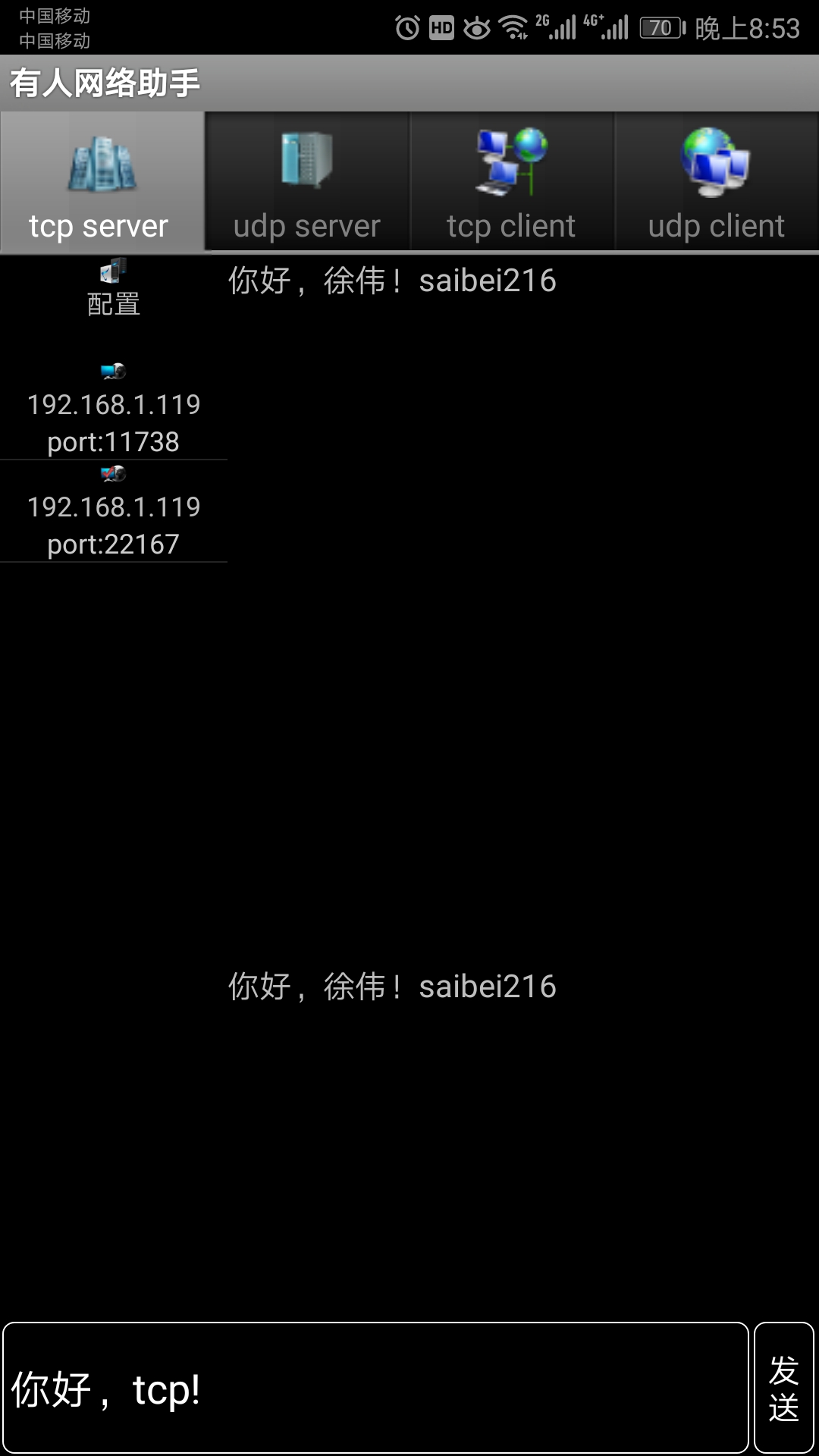 准备:先打开手机上的有人网络助手,新建TCP server——端口号8081,
