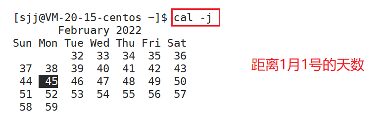 -j 显示在当年中的第几天(一年日期按天算,从1月1号算起,默认显示当前月在一年中的天数)