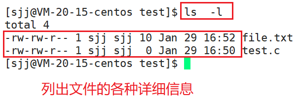 列出文件的详细信息。