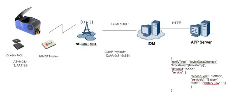在设备侧,智能设备采用了NB-IOT芯片,它和中国电信物联网开放平台之间通过CoAP协议通讯。CoAP报文的payload里是设备的应用数据。