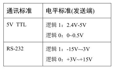 根据通讯使用的电平标准不同,串口通讯可分为TTL标准和RS-232标准,如下表: