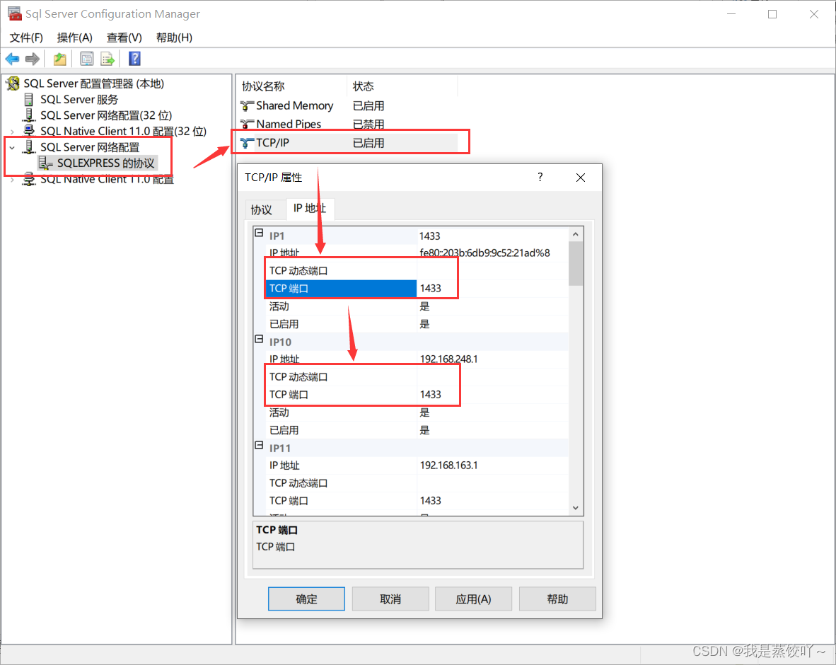 检查SQL Server 配置的是否为1433端口(注意TCP动态端口由原来的0改为空,禁用动态端口)、以及TCP/IP协议是否启动