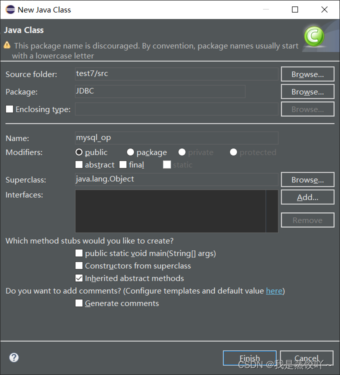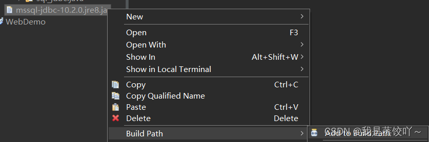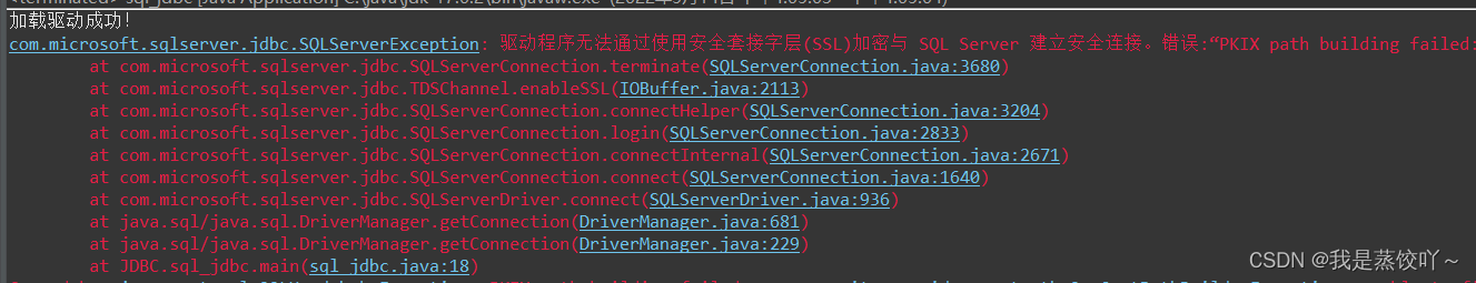 package JDBC; import java.sql.*; public class sql_jdbc { public Connection dbConn = null; public String driverName = "com.microsoft.sqlserver.jdbc.SQLServerDriver"; // 驱动配置 public String URL = "jdbc:sqlserver://localhost:1433;DatabaseName=test7;TrustServerCertificate=true;"; // 数据库位置 public String userName = "sa"; // 数据库用户名 public String userPwd = "123456"; // 数据库密码 // 连接数据库 public void insert() { // 导入SQL server驱动 // 1.加载驱动 try { Class.forName(driverName); // 2.建立连接 dbConn = DriverManager.getConnection(URL, userName, userPwd); System.out.println("SQL Server数据库连接成功!"); } catch (ClassNotFoundException | SQLException e) { e.printStackTrace(); System.out.println("SQL Server数据库连接失败!"); } } // 断开数据库 public void disconnect() { try { dbConn.close(); System.out.println("SQL Server数据库关闭成功!"); } catch (SQLException e) { e.printStackTrace(); System.out.println("SQL Server数据库关闭失败!"); } } } (2)JDBC连接MySQL