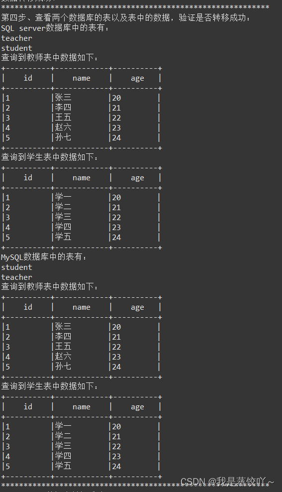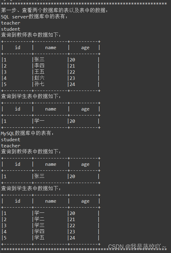 package main; import java.io.IOException; import java.sql.SQLException; import JDBC.*; public class main { public static void main(String[] args) throws IOException, SQLException { // 与库建立连接 sql_jdbc DB1 = new sql_jdbc(); mysql_jdbc DB2 = new mysql_jdbc(); DB1.insert(); DB2.insert(); // 初始化数据库,删除数据库两个表再新建表 sql_op op1 = new sql_op(); mysql_op op2 = new mysql_op(); op1.set_state(DB1); op1.init(); op2.set_state(DB2); op2.init(); op1.create_teacher_table(); op1.create_student_table(); op2.create_teacher_table(); op2.create_student_table(); // 向sql server数据库表中插入数据 op1.insert_teacher(1, "张三", 20); op1.insert_teacher(2, "李四", 21); op1.insert_teacher(3, "王五", 22); op1.insert_teacher(4, "赵六", 23); op1.insert_teacher(5, "孙七", 24); op1.insert_student(1, "学一", 20); // 向mysql数据库表中插入数据 op2.insert_teacher(1, "张三", 20); op2.insert_student(1, "学一", 20); op2.insert_student(2, "学二", 21); op2.insert_student(3, "学三", 22); op2.insert_student(4, "学四", 23); op2.insert_student(5, "学五", 24); // 第一步、查看两个数据表的表以及表中的数据 System.out.println("************************************************************"); System.out.println("第一步、查看两个数据库的表以及表中的数据:"); op1.show_tables(); op1.select_teacher(); op1.show_teacher(); op1.select_student(); op1.show_student(); op2.show_tables(); op2.select_teacher(); op2.show_teacher(); op2.select_student(); op2.show_student(); System.out.println("************************************************************"); // 第二步,将sql server数据库教师表中的数据插入mysql数据库中 System.out.println("第二步,将sql server数据库教师表中的数据插入mysql数据库中:"); op2.delete_teacher(); for (int i = 0;i <op1.row1 ; i++) { int a=Integer.parseInt(op1.result1[i][0]); int b=Integer.parseInt(op1.result1[i][2]); op2.insert_teacher(a,op1.result1[i][1],b); } System.out.println("数据转移成功!"); System.out.println("************************************************************"); // 第三步,将mysql数据库中学生表中的数据插入sql server数据库 System.out.println("第三步,将mysql数据库中学生表中的数据插入sql server数据库:"); op1.delete_student(); for (int i = 0;i <op2.row2 ; i++) { int a=Integer.parseInt(op2.result2[i][0]); int b=Integer.parseInt(op2.result2[i][2]); op1.insert_student(a,op2.result2[i][1],b); } System.out.println("数据转移成功!"); System.out.println("************************************************************"); // 第四步、查看两个数据表的表以及表中的数据,验证是否转移成功 System.out.println("第四步、查看两个数据库的表以及表中的数据,验证是否转移成功:"); op1.show_tables(); op1.select_teacher(); op1.show_teacher(); op1.select_student(); op1.show_student(); op2.show_tables(); op2.select_teacher(); op2.show_teacher(); op2.select_student(); op2.show_student(); System.out.println("************************************************************"); // 第五步、断开与数据库的连接 DB1.disconnect(); DB2.disconnect(); } }