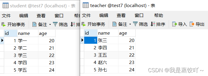 // 查看教师表中的数据并以数组的形式保存每一行的数据 public String[][] select_teacher() throws IOException { try { String sql = "SELECT * FROM teacher"; ResultSet rs = state.executeQuery(sql); row1 = 0; while (rs.next()) { row1++; } result1 = new String[row1][3]; rs.beforeFirst(); int i = 0; while (rs.next()) { result1[i][0] = rs.getString("id"); result1[i][1] = rs.getString("name"); result1[i][2] = rs.getString("age"); i++; } } catch (SQLException e) { e.printStackTrace(); } return result1; } // 显示教师表中的数据 public void show_teacher() throws IOException { System.out.println("查询到教师表中数据如下:"); System.out.println("+----------+------------+----------+"); System.out.println("| id | name | age |"); System.out.println("+----------+------------+----------+"); for (int i = 0; i < row1; i++) { System.out.printf("|%-10s|%-10s|%-10s|n", result1[i][0], result1[i][1], result1[i][2]); } System.out.println("+----------+------------+----------+"); } // 新建一个学生表 public void create_student_table() throws IOException { try { String sql = "CREATE TABLE student(id INT PRIMARY KEY NOT NULL,name VARCHAR(20) NOT NULL,age INT NOT NULL)"; state.executeUpdate(sql); System.out.println("MySQL创建学生表成功!"); } catch (SQLException e) { e.printStackTrace(); System.out.println("MySQL创建学生表失败!"); } } // 向学生表中插入数据 public void insert_student(int id, String name, int age) throws IOException { try { String sql = "INSERT INTO student(id,name,age) VALUES(" + id + ",'" + name + "'," + age + ")"; state.executeUpdate(sql); } catch (SQLException e) { e.printStackTrace(); } } // 删除学生表中的所有数据 public void delete_student() throws IOException { try { String sql = "DELETE FROM student"; state.executeUpdate(sql); } catch (SQLException e) { e.printStackTrace(); } }