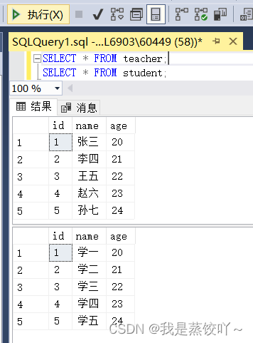 // 查看教师表中的数据并以数组的形式保存每一行的数据 public void select_teacher() throws IOException { try { String sql = "SELECT * FROM teacher"; ResultSet rs = state.executeQuery(sql); row1 = 0; while (rs.next()) { row1++; } result1 = new String[row1][3]; rs.beforeFirst(); int i = 0; while (rs.next()) { result1[i][0] = rs.getString(1); result1[i][1] = rs.getString(2); result1[i][2] = rs.getString(3); i++; } } catch (SQLException e) { e.printStackTrace(); } } // 显示教师表中的数据 public void show_teacher() throws IOException { System.out.println("查询到教师表中数据如下:"); System.out.println("+----------+------------+----------+"); System.out.println("| id | name | age |"); System.out.println("+----------+------------+----------+"); for (int i = 0; i < row1; i++) { System.out.printf("|%-10s|%-10s|%-10s|n", result1[i][0], result1[i][1], result1[i][2]); } System.out.println("+----------+------------+----------+"); } // 新建一个学生表 public void create_student_table() throws IOException { try { String sql = "CREATE TABLE student(id INT PRIMARY KEY NOT NULL,name VARCHAR(20) NOT NULL,age INT NOT NULL)"; state.executeUpdate(sql); System.out.println("SQL Server创建学生表成功!"); } catch (SQLException e) { e.printStackTrace(); System.out.println("SQL Server创建学生表失败!"); } } // 向学生表中插入数据 public void insert_student(int id, String name, int age) throws IOException { try { String sql = "INSERT INTO student(id,name,age) VALUES(" + id + ",'" + name + "'," + age + ")"; state.executeUpdate(sql); } catch (SQLException e) { e.printStackTrace(); } } // 删除学生表中的所有数据 public void delete_student() throws IOException { try { String sql = "DELETE FROM student"; state.executeUpdate(sql); } catch (SQLException e) { e.printStackTrace(); } } // 查看学生表中的数据并以数组的形式保存每一行的数据 public void select_student() throws IOException { try { String sql = "SELECT * FROM student"; ResultSet rs = state.executeQuery(sql); row2 = 0; while (rs.next()) { row2++; } result2 = new String[row2][3]; rs.beforeFirst(); int i = 0; while (rs.next()) { result2[i][0] = rs.getString(1); result2[i][1] = rs.getString(2); result2[i][2] = rs.getString(3); i++; } } catch (SQLException e) { e.printStackTrace(); } }
