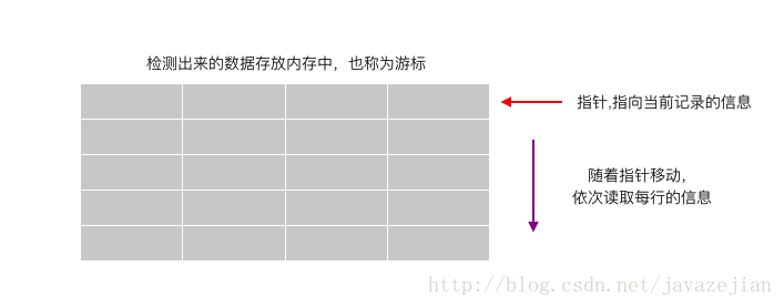 在前面的分析中可知sql的检索操作返回的数据几乎都是以整个集合的形式,也就是说sql善于将多条查询记录集中到一起并返回,倘若现在需要一行行地处理查询的结果,这对于sql语句来说确实是个难题,好在存在一种称为游标的技术可以解决这个问题,所谓的游标就就是可以将检索出来的数据集合保存在内存中然后依次取出每条数据进行处理,这样就解决了sql语句无法进行行记录处理的难题,游标的读取图解如下: