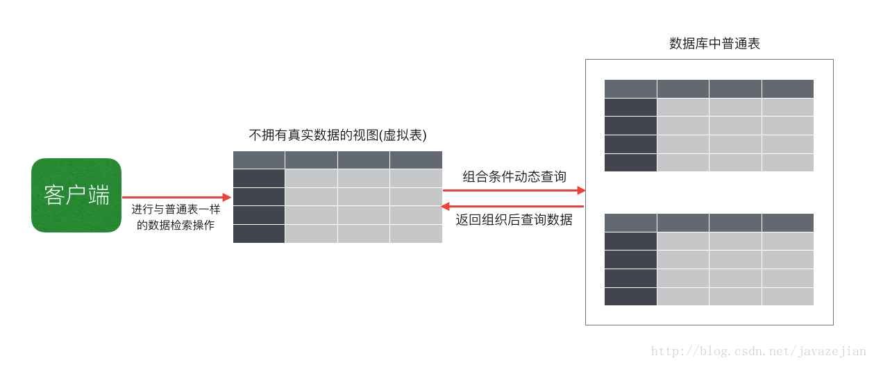 到此对于视图的创建和使用都比较清晰了,现在准备进一步认识视图的本质,前面我们反复说过,视图是一张虚拟表,是不带任何数据的,每次查询时只是从普通表中动态地获取数据并组合,只不过外表看起来像一张表罢了。其原理通过下图便一目了然: