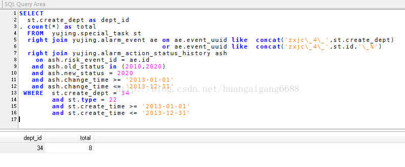 查询涉及的表有:立项表(special_task)、预警事件表(alarm_event)、预警被督办信息表(alarm_action_status_history)