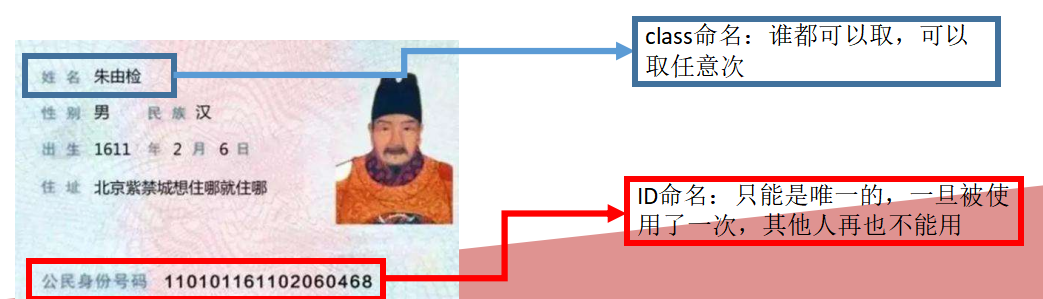 id 命名规则:必须以字母开头,后面可以有字母、数字、下划线、横线,严格区分大小写。每个 id 属性值必须是唯一的,不能与其他的 id 同名。
