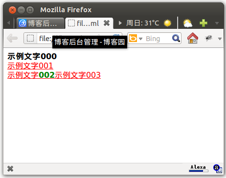 <style type="text/css"> /*下面是一个a标记,即链接标记*/ a{ color: red; } /*下面是一个后代选择器,其中在外面的是一个a标记,在里面的是一个b标记,即粗体标记*/ a b{ color: green; } </style> <body> <b>示例文字000</b></br><!--参照组,单纯的b标记,未在上面CSS中定义--> <a href="#">示例文字001</a></br><!--参照组,a标记,CSS中定义为红字--> <a href="#">示例文字<b>002</b>示例文字003</a><!--通过后代选择器,将a标记中的b标记找出来,并给出绿色--> </body>