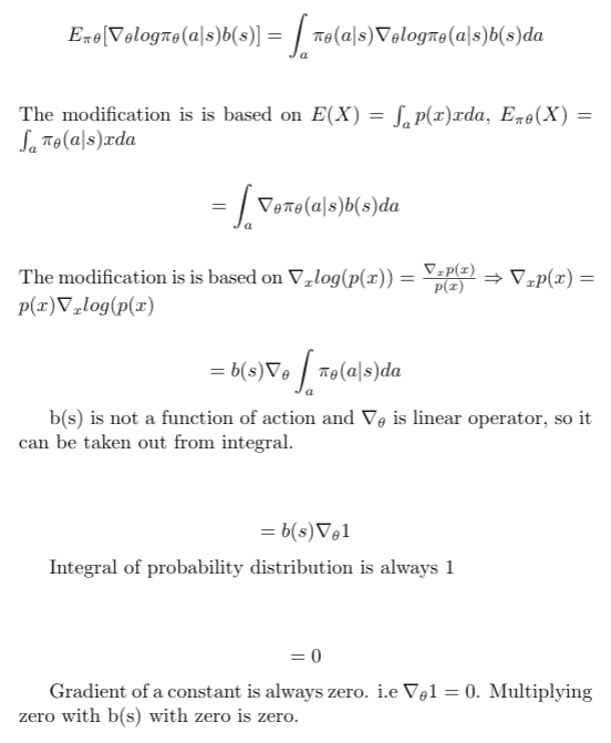 如果带有基线的第二项为零,则可以证明添加基线函数b在梯度估计中未添加偏差。 那意味着