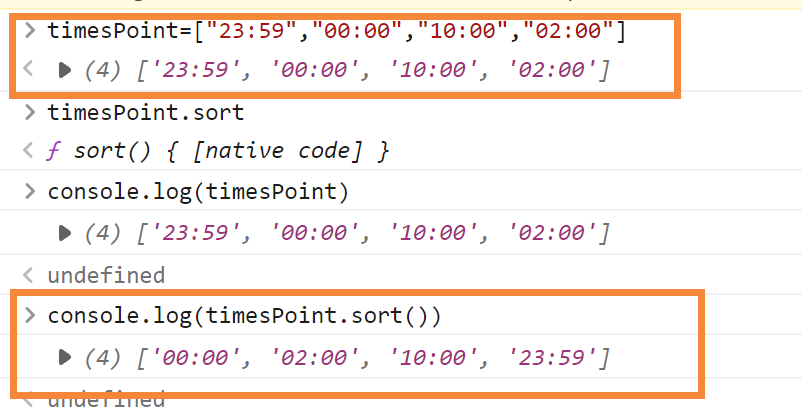 注意: 排序这里有个坑,对于字符串数组,即该题中的timePoints,可以直接用sort()排序。但对于数值型的数组,要写成Array.sort((a,b)=>a-b)的形式,因为Js是弱类型语言,它看不出里面int类型的数字。