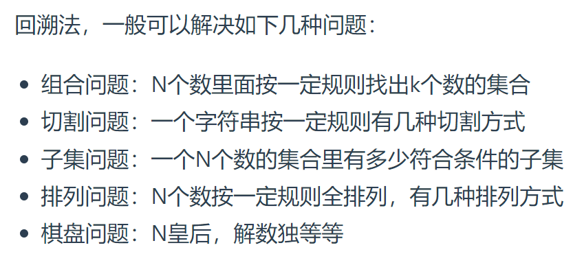 回溯可以解决:组合、切割、子集、排列、棋盘这类问题