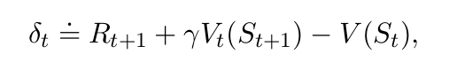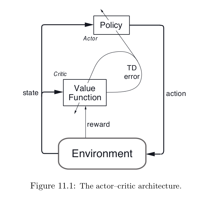 Actor-critic methods 是 gradient-bandit methods自然的拓展到 TD-learning和全部的 RL 学习问题. 通常情况下, the critic 是状态-值函数.再一次的动作选择之后,the critic 评价新的策略来检测是否事情朝着期望的方向发展.评价通常是根据 TD error 得到的: