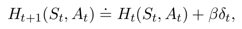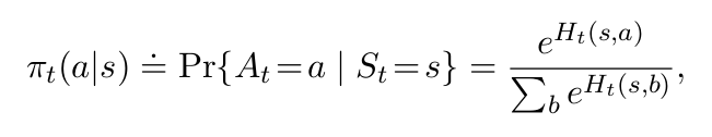 其中,$H_t(s, a)$是在第 t 时刻由策略参数可改变的 actor 的值,表示在时刻 t 状态 s 下选择每一个动作 a 的趋势(preference).通过增加或者减少 $H_t(S_t, A_t)$ 来调整上述选择,即:
