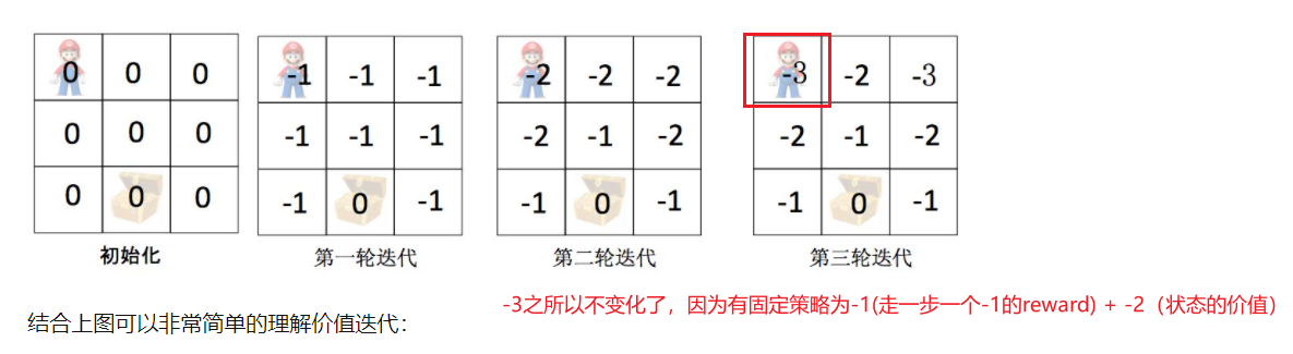 Policy-Iteration & Value iteration:还是结合例子看比较直观;策略迭代(选定策略,更新策略),价值迭代(多次迭代直至收敛)