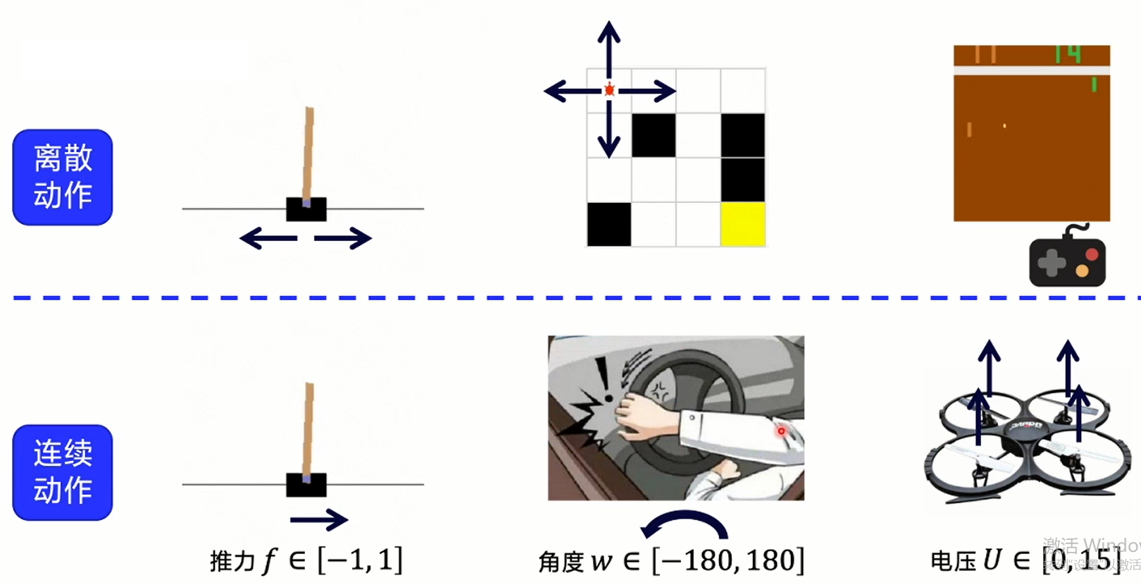 之前我们做出的决策都是基于离散状态的,简单来说是类似于在做“选择题”。而连续的动作,我们输出的将不是某个动作,而是更加细致的动作的程度,类比深度学习的分类任务与回归任务。当然,具体选何种模型可以根据具体情况灵活选择,有时离散动作和连续动作之间是可以灵活转换的。