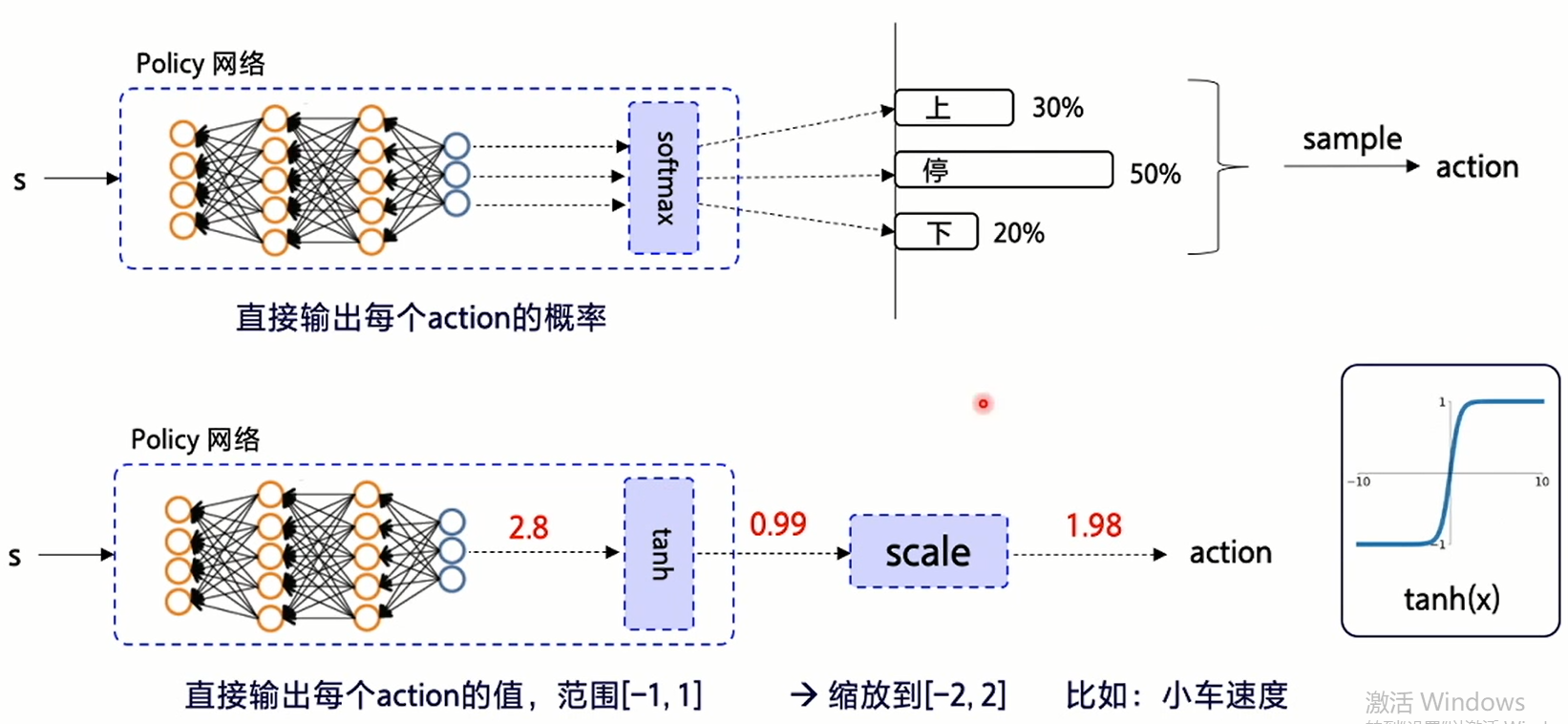 用于连续动作输出的值我们需要通过tanh将其收敛至[-1,1]后,再缩放道相应的动作程度之中: