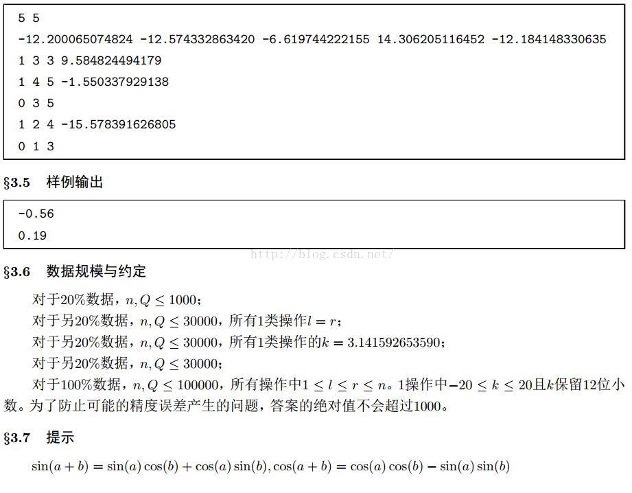 #define push(a) ans1=tree[(a)].sin,ans2=tree[(a)].cos,tree[(a)].sin=ans4*ans1+ans3*ans2,tree[(a)].cos=ans4*ans2-ans3*ans1,tree[(a)].lazy+=K