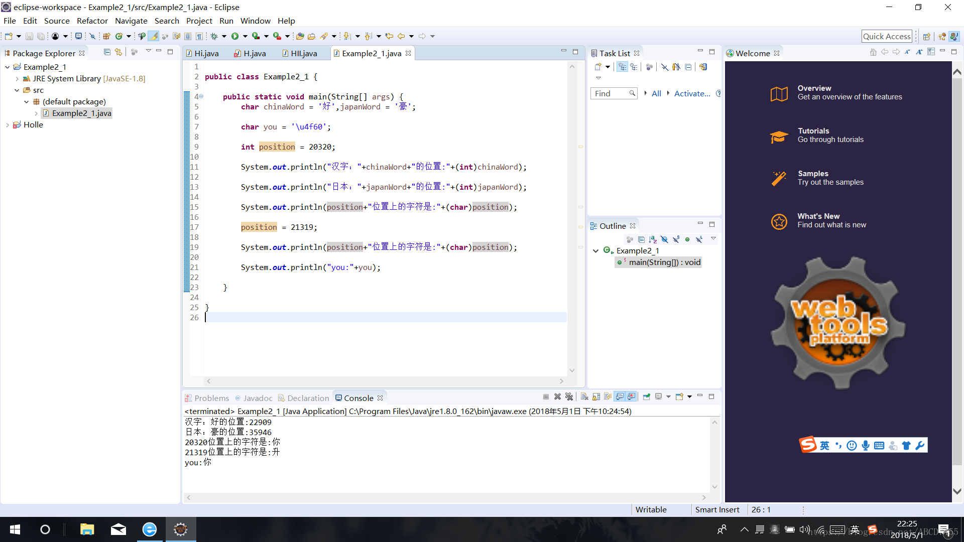 System.out.println("日本:"+japanWord+"的位置:"+(int)japanWord);