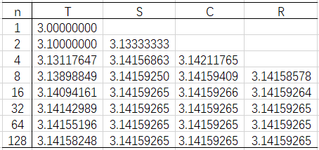 [3.13333333 3.14156863 3.1415925 3.14159265 3.14159265 3.14159265