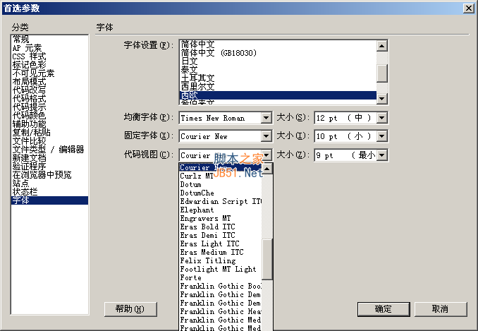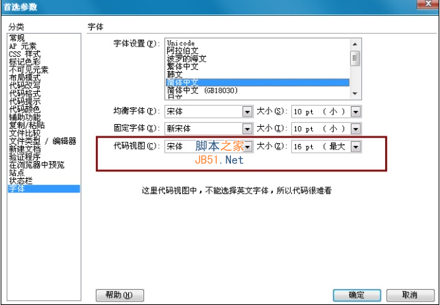 然后打开Dreamweaver。编辑-》首选参数-》字体-》代码视图,现在可以选择的字体就很多了吧,o(∩_∩)o...。