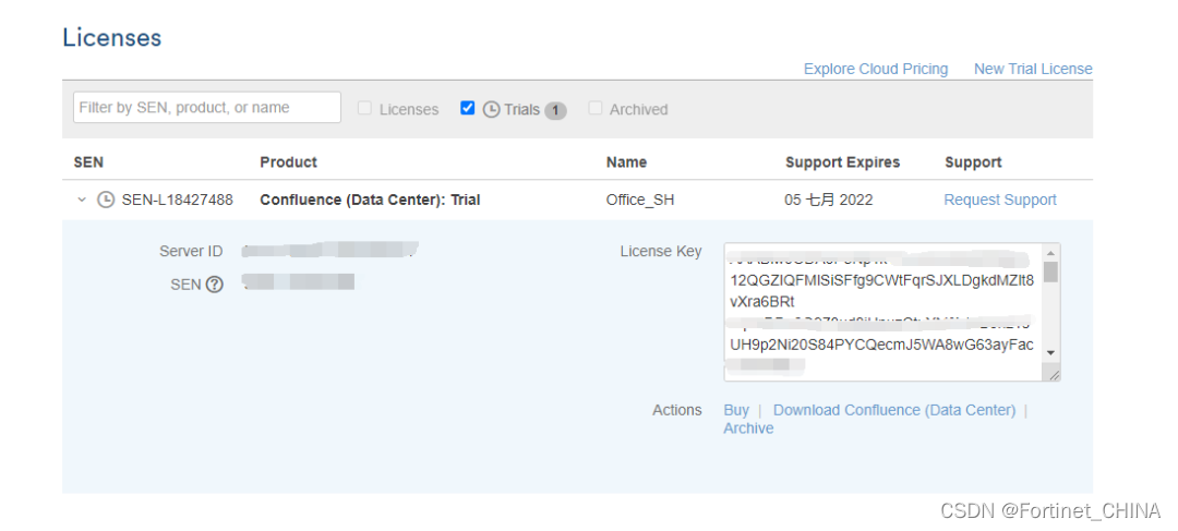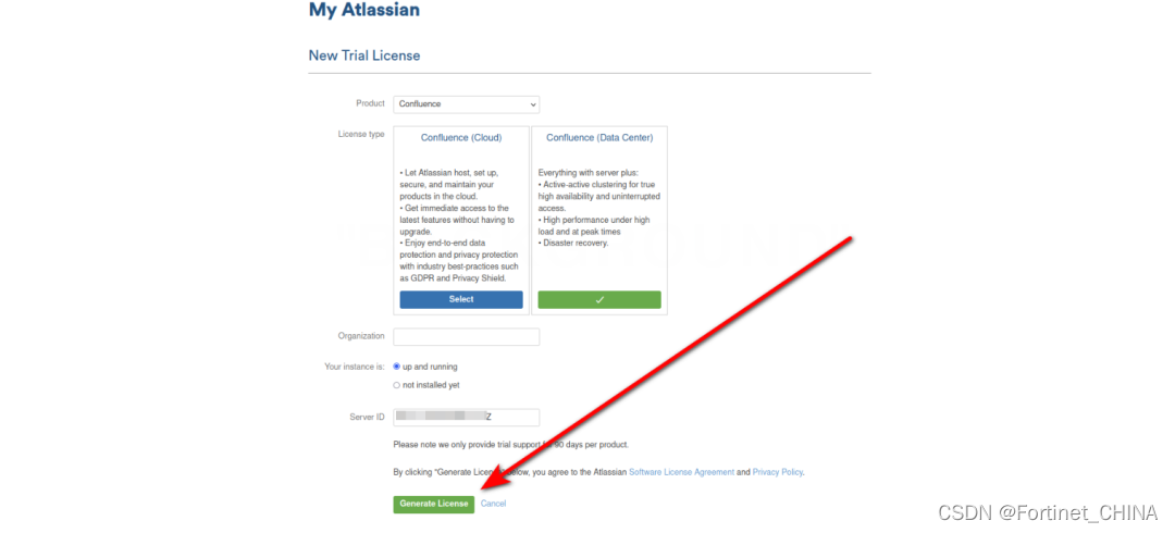 会进入安装引导,会要求填写license key。点击“Get an evaluation license”,去Atlassian官方申请一个Confluence Server的测试证书: