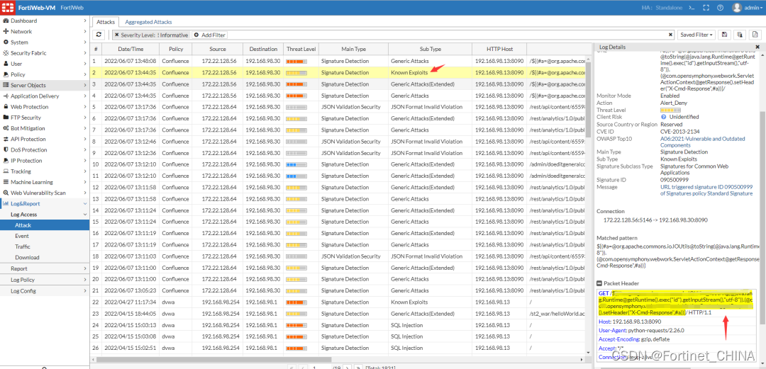 2、考虑到业务连续性和对威胁可见性的管理要求,建议采用Fortinet产品解决方案防护Confluence 零日攻击,同时Fortinet对已购买相关产品的用户已推送了相关的特征库,用于防护来自此漏洞的相关攻击。
