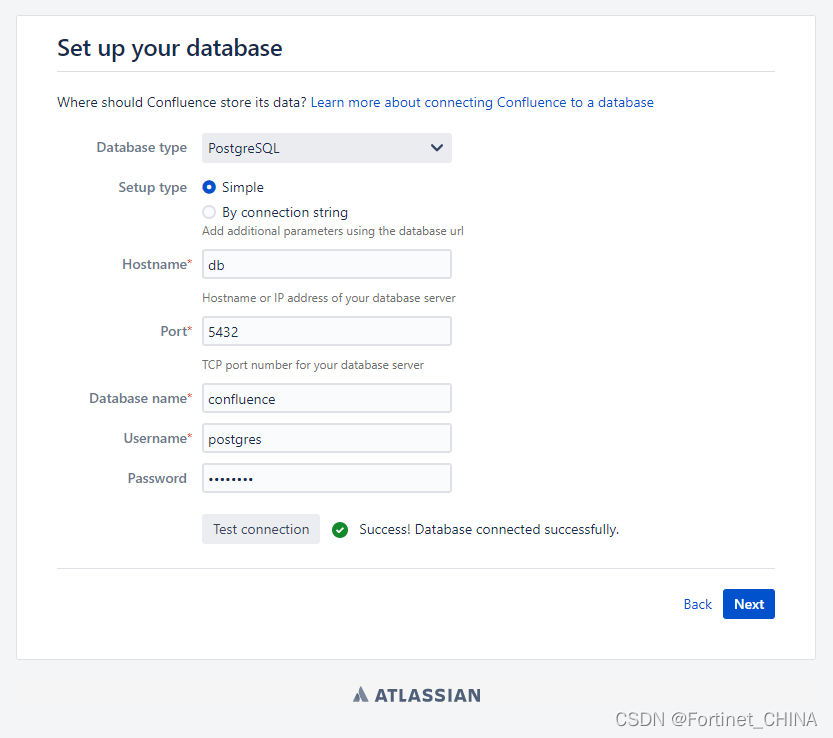 4、下一步,设置数据库信息的页面,PostgreSQL数据库地址为db,数据库名称confluence,用户名密码均为postgres。