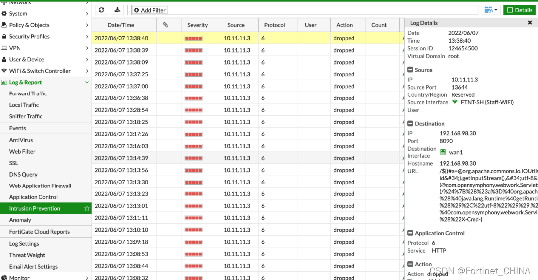 使用Fortinet解决方案后,漏洞执行行为被阻断: