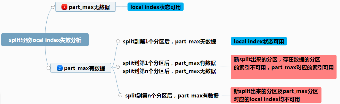 --split出来的全部分区【不能够存放】part_max里面的全部数据,split后part_max不为空,split 【会】 引起索引失效。失效的索引为:新split的全部索引和part_max;