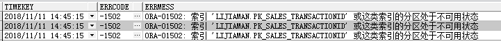 问题2:由于存在主键约束(带有唯一性索性),在失效索引相关的分区上,数据DML时会引发ORA-01502错误。我们可以从异常捕获表sales_exception查看异常信息: