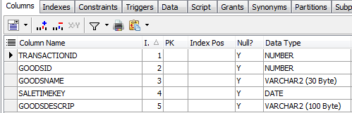 SQL> select owner,table_name,index_name,uniqueness,status from dba_indexes i 2 where i.owner = 'LIJIAMAN' and i.table_name = 'SALES'; OWNER TABLE_NAME INDEX_NAME UNIQUENESS STATUS ------------------------------ ------------------------------ ------------------------------ ---------- -------- LIJIAMAN SALES PK_SALES_TRANSACTIONID UNIQUE N/A LIJIAMAN SALES GOODSID NONUNIQUE N/A
