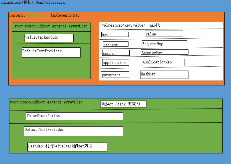 上图中:整个蓝色的为valuestack,橘色为OGNLContext,绿色为root对象栈。从图中可以看出OGNLContext包含了map栈和对象栈。这样存在两份对象栈方便使用。这个蓝色值栈的生命周期是客户发起的一次请求。