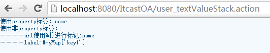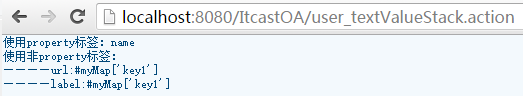 从效果图中看出使用#号获取map中的值使用property的标签没有问题,使用其他类型标签表达式被当做是字符串显示了。出现这种情况就需要使用到%,所以OGNL表达式中的%是用来标记的。