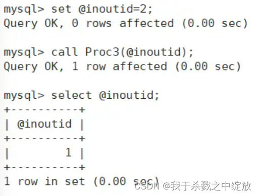 INOUT输入输出参数: 既表示调用者向过程传入值,又表示过程向调用者传出值(值只能是变量)