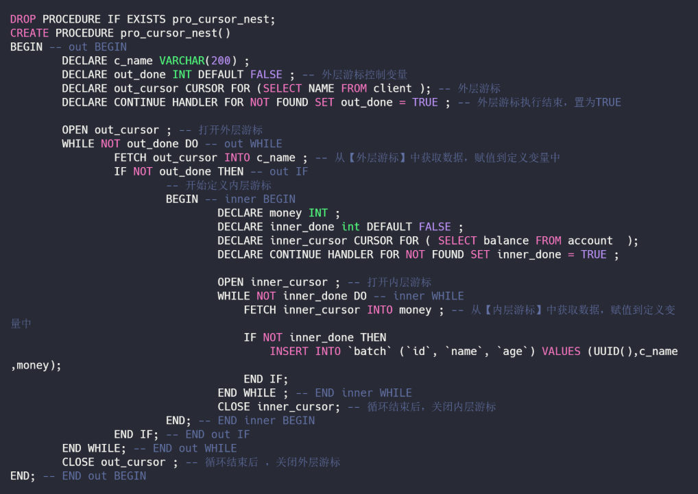 CLOSE inner_cursor; -- 循环结束后,关闭内层游标