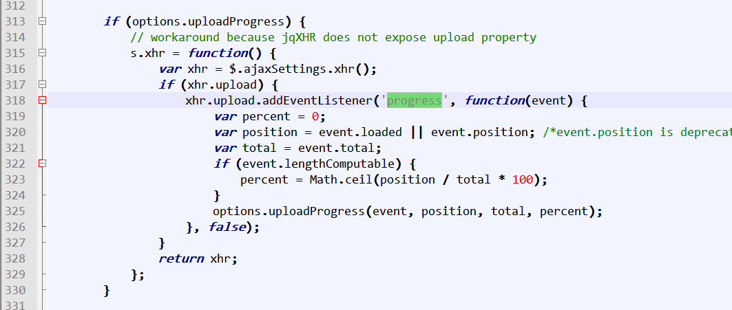 那么我也可以在$.ajax 方法中添加progress事件处理函数了。为了把对dom的操作从上传业务中抽取出来,我决定以插件的形式写。下面是插件的代码