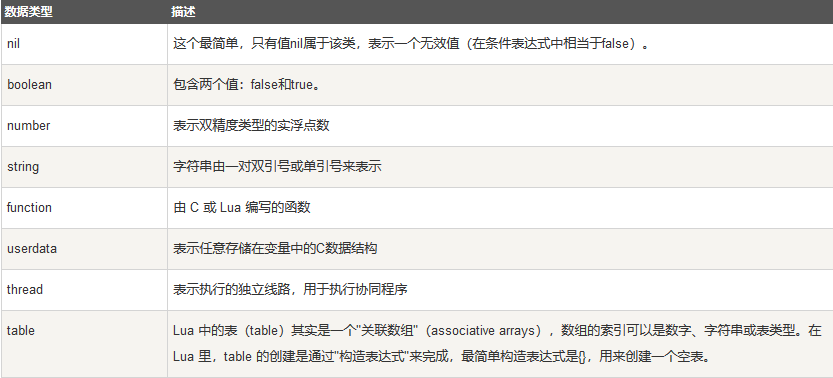 以上就是勤恳棉花糖最近收集整理的关于Lua - 八种数据类型的全部内容,更多相关Lua内容请搜索靠谱客的其他文章。