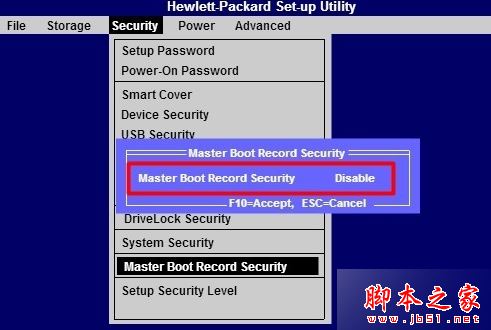 2、将Master Boot Record Security设置更改为Disable,设置完成后按F10保存;